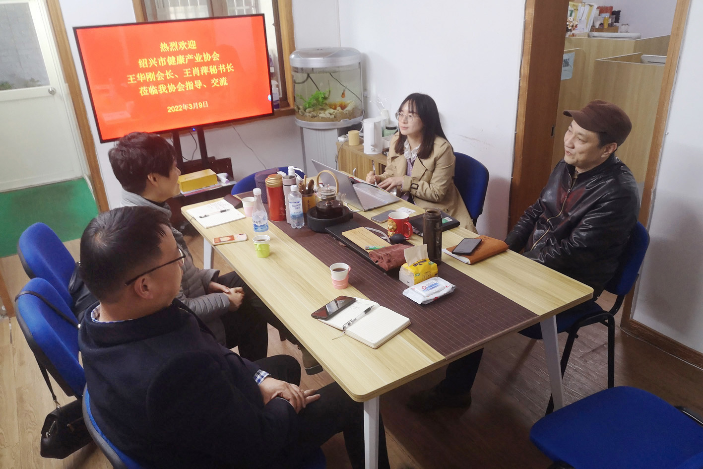 3月9日,绍兴市健康产业协会王华刚会长、王肖萍秘书长一行参访杭州市健康促进协会,受到杭州市健促会张纯秘书长、瞿雁副秘书长等一行的热情接待。
